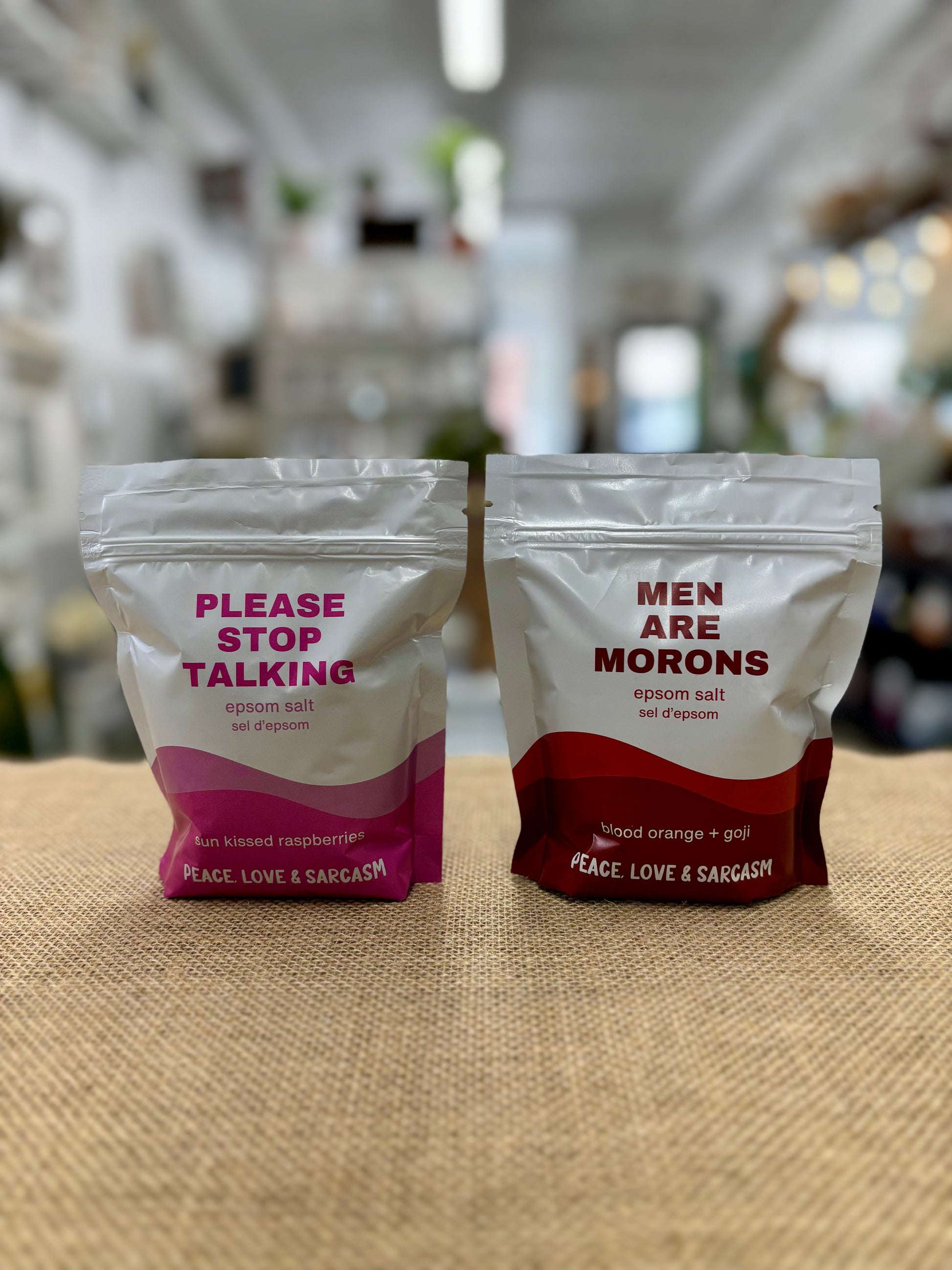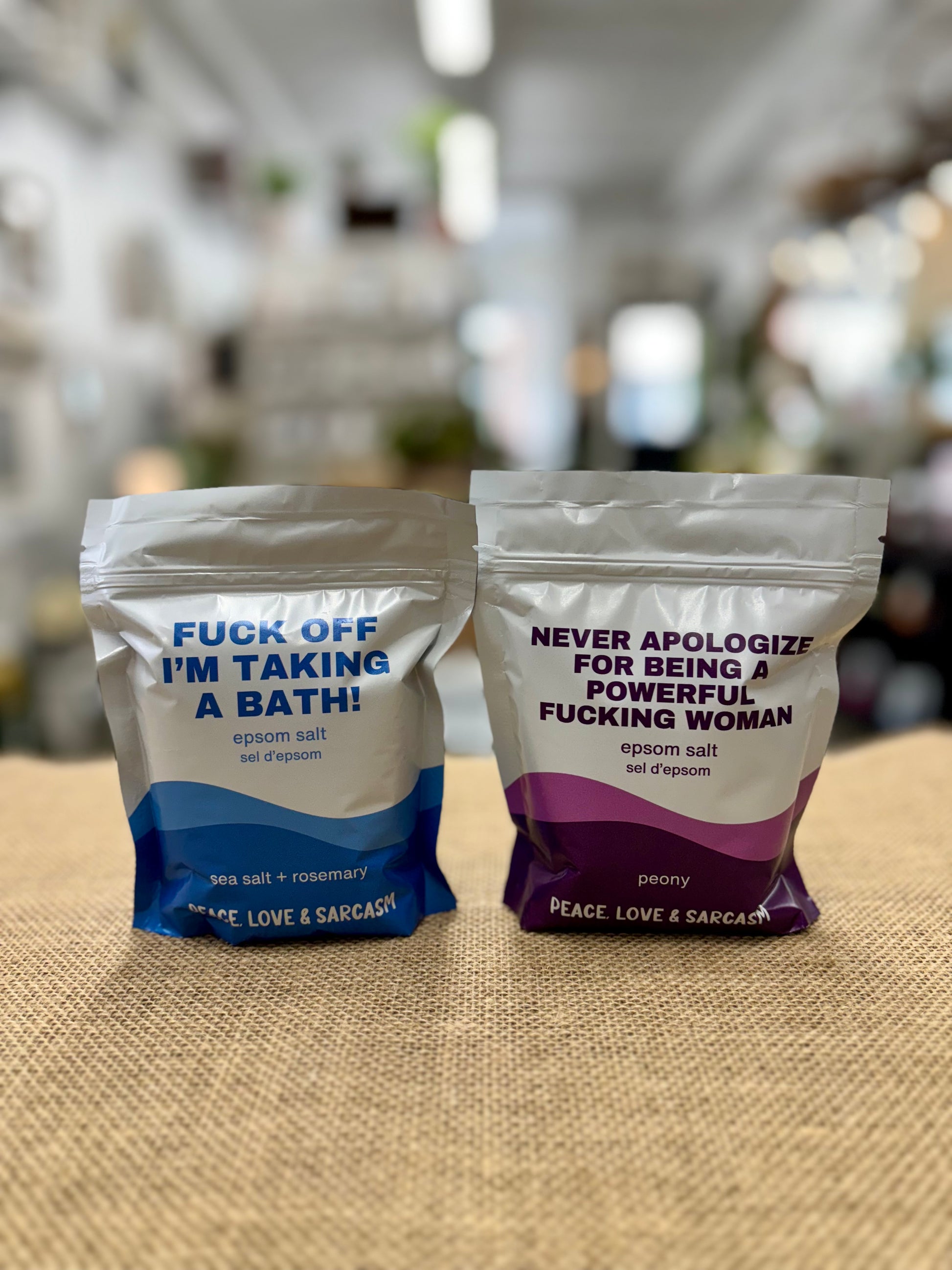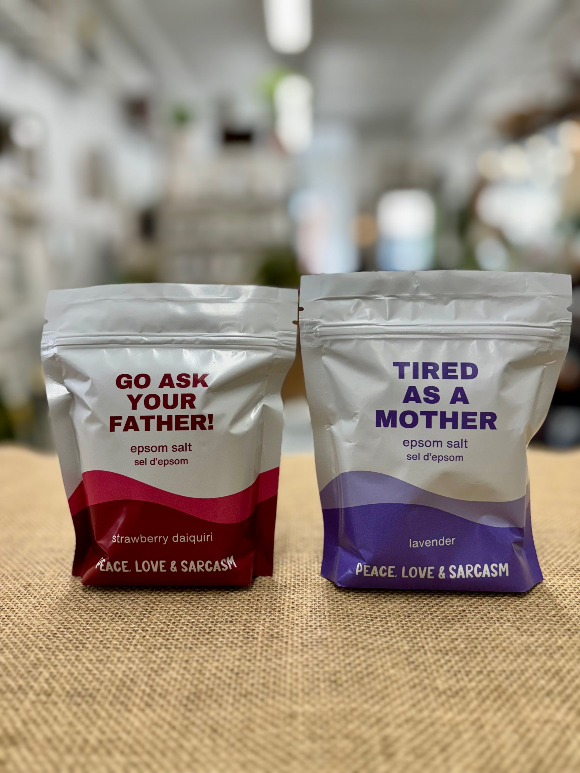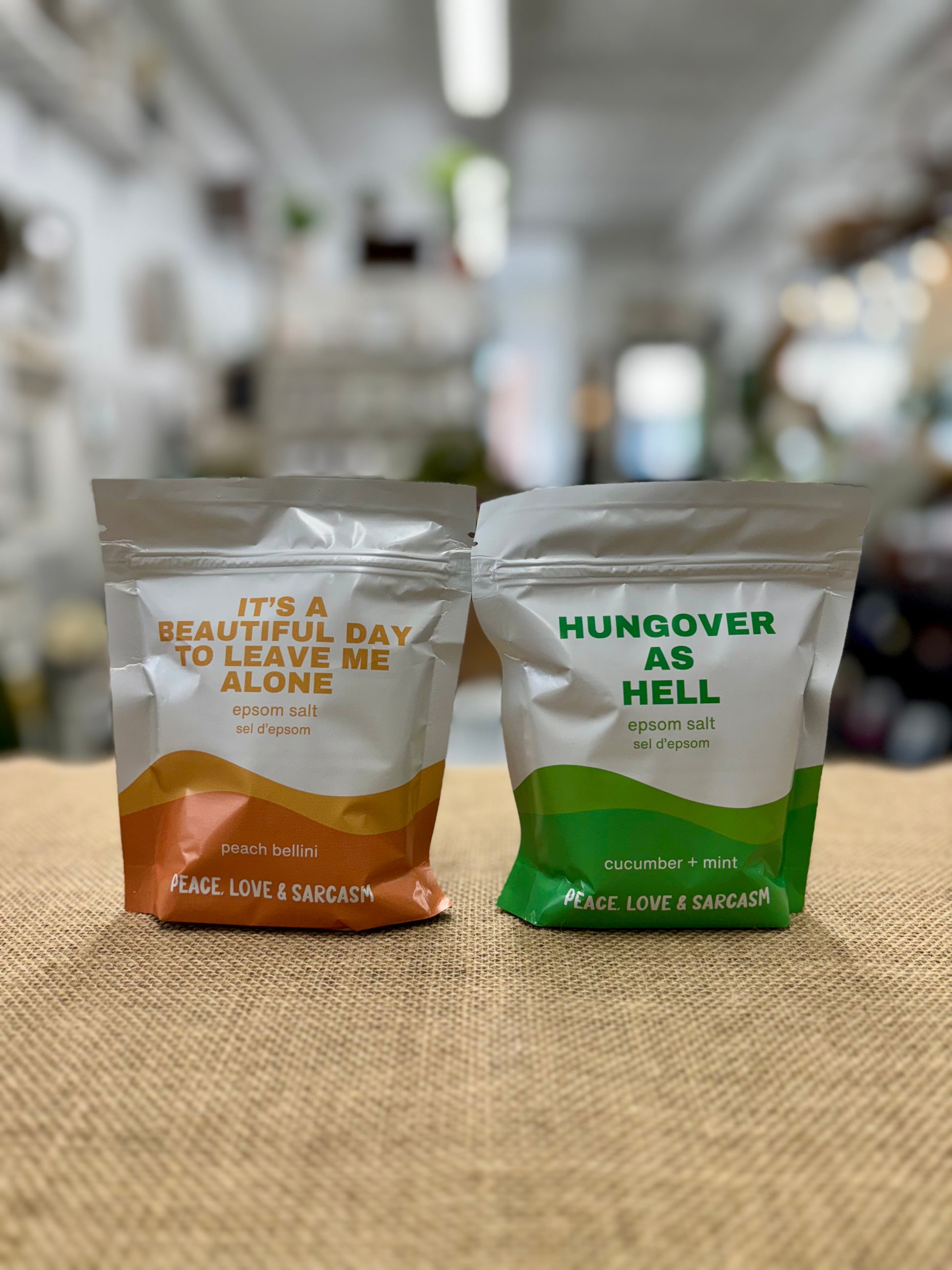 "Relax with a touch of sass. Handcrafted in Newfoundland, our bath salts pack a punch of playful names and make for unique gifts. Indulge in PEACE LOVE and SARCASM for a fun and refreshing bath experience. (A little sarcasm never hurt anyone ;) )"