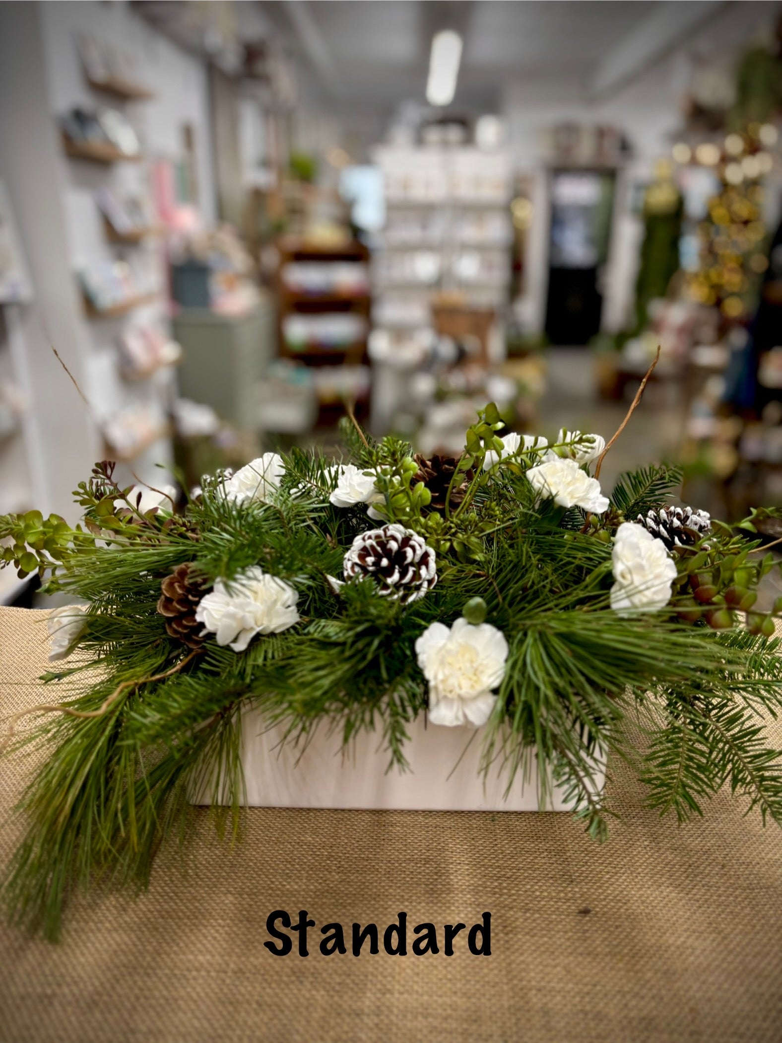 Transform your home into a tranquil winter wonderland with Silent Night. The elegant combination of white and green, accented with pinecones, in a porcelain rectangular vase will bring a sense of peace and serenity to any space. Adorned with delicate white flowers, this centerpiece is the perfect addition to your holiday decor.