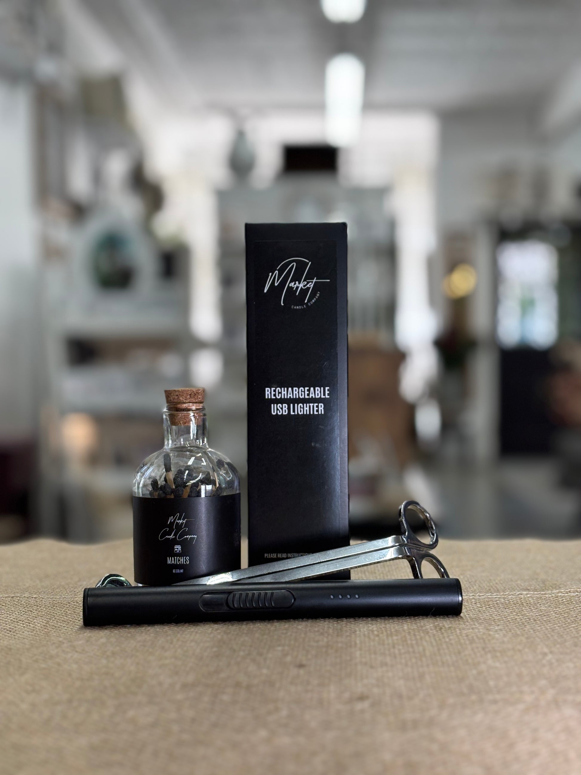 Complete the candle experience with Market Candle’s refined accessories—a sleek USB lighter, elegant matches, and a precise wick trimmer. Crafted for candle lovers who appreciate both function and style, these accessories make an exceptional gift that enhances the ambiance with effortless sophistication.