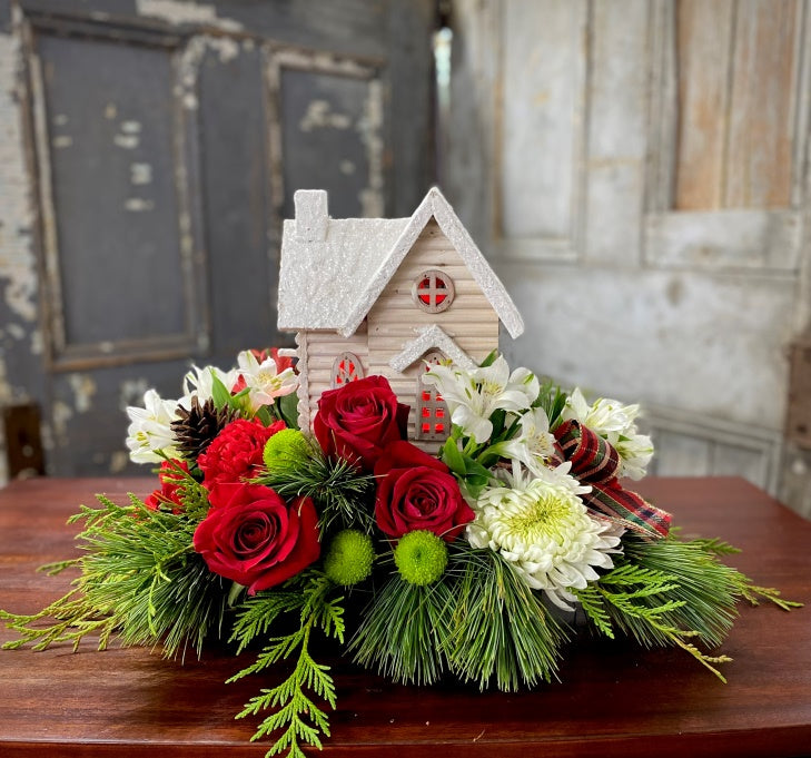 Transform your holiday décor with this enchanting Whimsical House, beautifully illuminated to create a warm, inviting glow. Adorned with vibrant seasonal blooms in classic red, white, and green, it captures the essence of festive charm. Complemented by rustic pinecones, shimmering Christmas balls, and elegant ribbon accents, this whimsical piece brings timeless holiday magic to any space—whether displayed on a shelf, mantel, or as a stunning centerpiece that sparks joy and conversation.